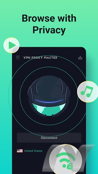 En utilisant VPN Proxy Master, l'utilisateur a la possibilité de contourner le blocage des sites et des services, de cacher son adresse IP réelle et de protéger ses données des regards indiscrets.