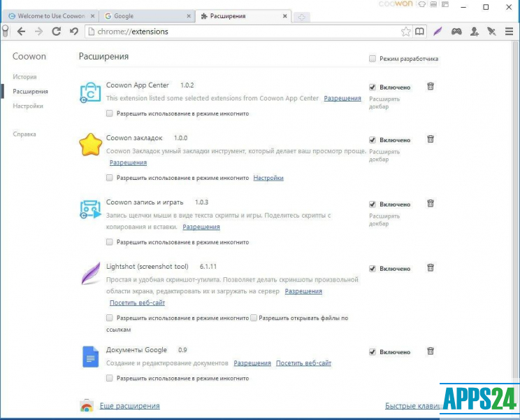 Le navigateur Coowon est un navigateur basé sur Google Chrome qui contient des options supplémentaires spécifiquement destinées aux joueurs. Le programme est conçu pour une utilisation normale d'Internet avec les tâches standard de l'utilisateur, mais il possède certaines caractéristiques qui simplifient le processus de passage des jeux du navigateur.